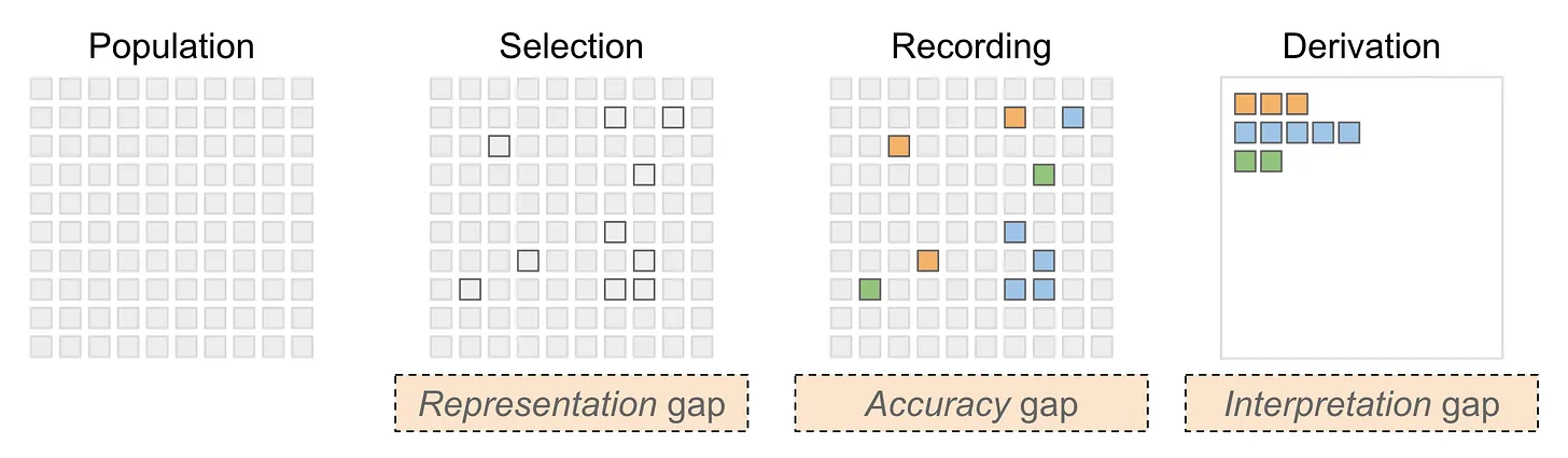 Accuracy gap – this is familiar to statisticians as measurement error, defined as the gap between the (unobservable) true values and the observed values. If we are measuring someone's weight, it may be the case that the scale does not give accurate measurements - the inaccuracy can be a systematic bias (e.g. it starts not from zero) or the scale can suffer from a high margin of error, or both at the same time.