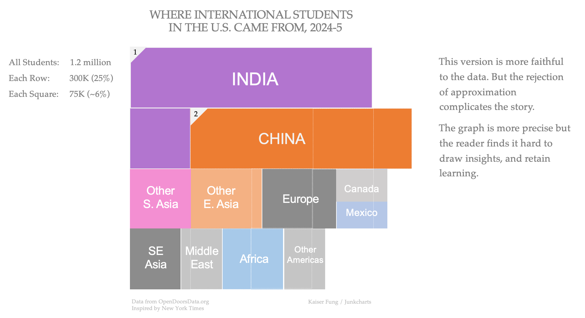 If the readers thought that Europe, Middle East, Southeast Asia, etc. all contributed equal shares of international students - and they would be adrift by a few percentage points one way or the other, is it worse than them trying to recall which region had 8 percent, and which region had 5 percent?
