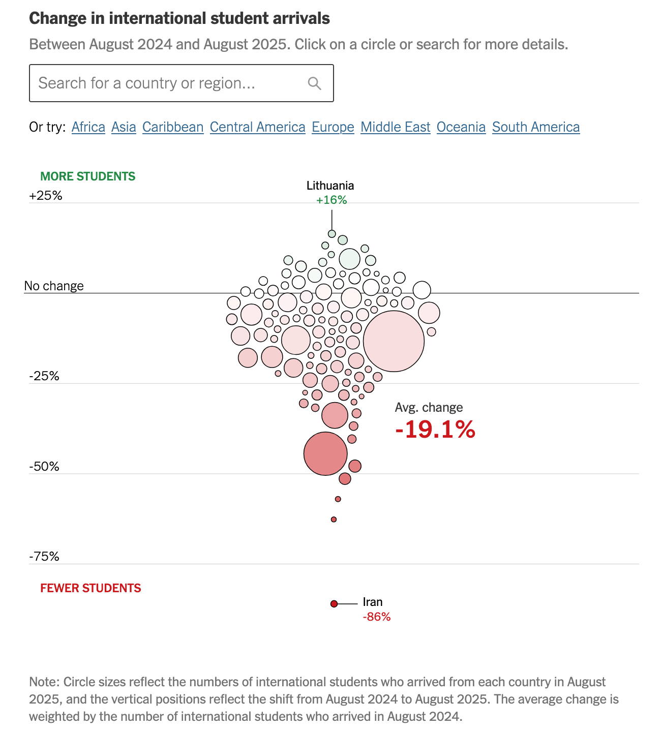This visualization addresses a clear question with appropriate data but suffers from poor visual design choices. The beeswarm plot prioritizes aesthetics over functionality, making it nearly impossible to identify specific countries or understand patterns without extensive interaction. The design would benefit from a simpler, more readable format that allows viewers to quickly grasp both individual country performance and overall trends.