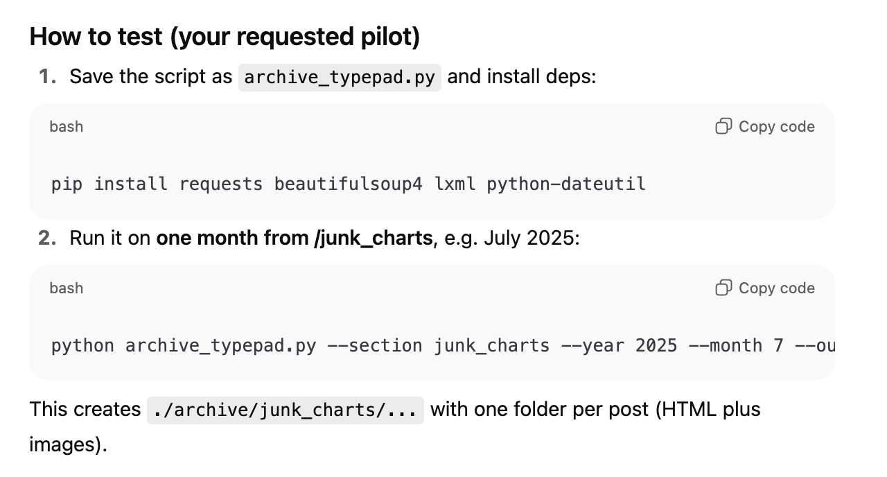 I'd like to return your attention to the first prompt shown above, in which I also clipped the top part of the AI's response. The section you can see explains how the scraper will nevigate my blog. Remember that it has to visit every blog post sequentially. While researching my prompt, the AI visited my blog and discovered that old posts are grouped by month, with all posts published in a given month aggregated on the same monthly page. There exists also a top-level index page, called archive.html, that contains links to each monthly page. Thus, the scraper first visits that index page, and using it as a map, it loads each monthly page, and on each monthly page, it extracts the required text and images. This scraping strategy makes sense to me.