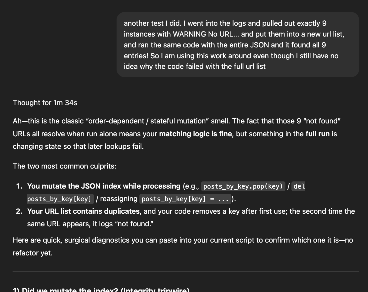 At this point, the AI coder and I had become a team. I was running diagnosis tests on the side. What I discovered: if I pulled those unmatched URLs from the error log, putting them in their own file, and ran the same code on this much smaller set of links, the AI code managed to find those 10 posts, and pull the images out.
