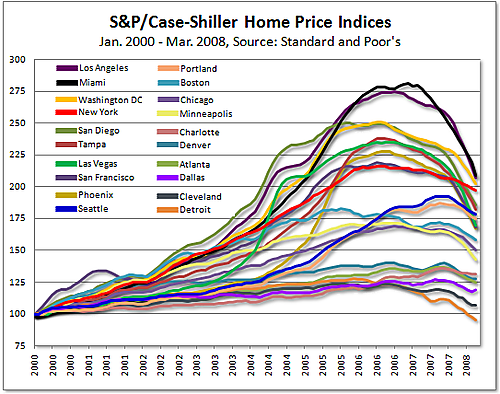 Via Adam came this "colorful" chart of the rise and fall of house prices since 2000, as measured by the Case-Shiller index. He commented that this showed the old saw "the taller they are, the harder they fall".