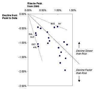 The diagonal line indicated equal rates of growth and subsequent decline. The cities above the line, especially Boston and New York, have witnessed declines that were much slower than the earlier rises. On the other end, cities like Detroit, Cleveland, Atlanta and Dallas suffered price deflation much faster than earlier inflation. Indeed, the ratio of decline to rise rates is given by the slope from the origin to the dot.