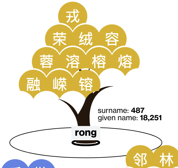 "Rong" is rarely a surname so the thicker shadow is right at the base of the trunk while the thinner shadow related to given names is more visible. Interestingly, only one of the four tones appears in this "rong" tree.