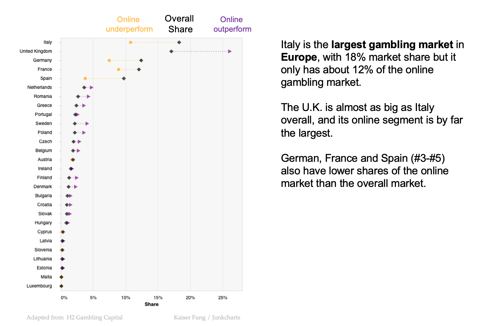I'm using a different measure of online share from the designer of the original. On my chart, "online share" is each country's share of the aggregate European online gambling revenues. The total of these online shares sum to 100%. On the original chart, "online share" is defined as online's share of total gambling revenues within each country. The total of these online shares across countries is meaningless. The online share and offline share sum to 100% for each country.