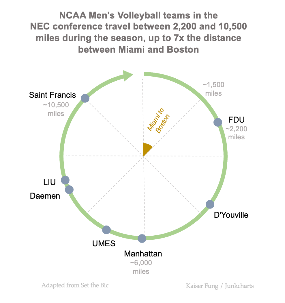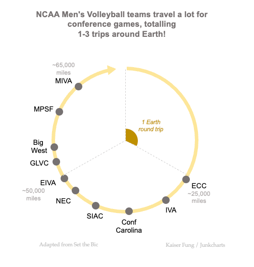 Long-time reader Chris P. sent me to an Instagram user (link) who analyzed the travel schedules of all the NCAA men's volleyball teams.