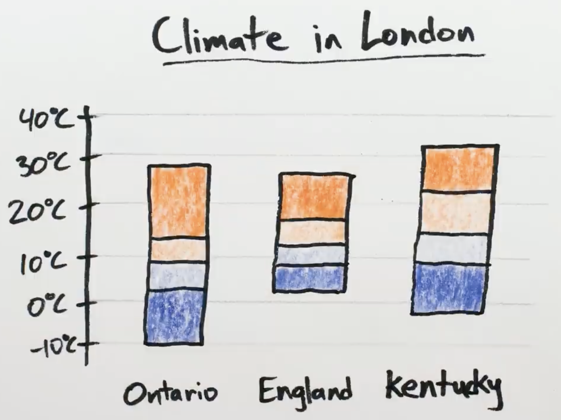 What can we learn from this chart? The range of temperatures is narrowest in London, England while it is broadest in London, Ontario (Canada). The highest temperature is in London, Kentucky (USA) while the lowest is in London, Ontario.
